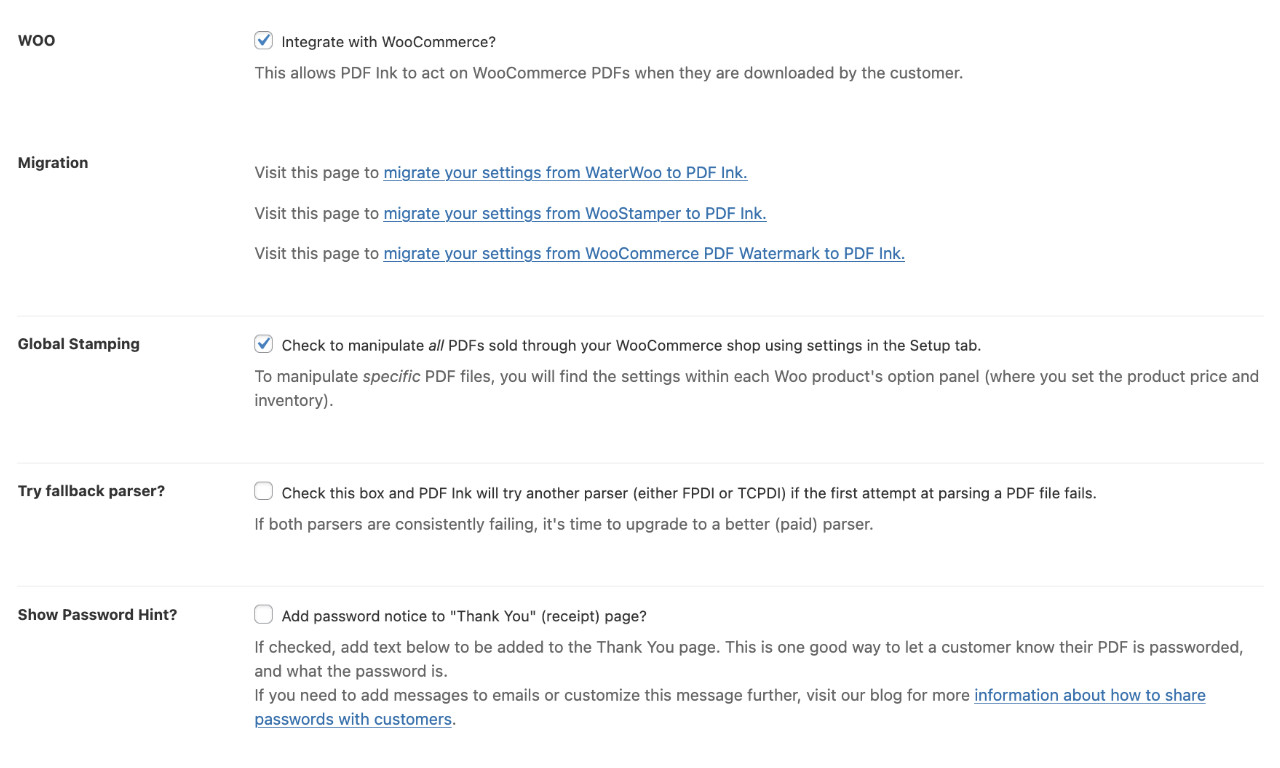 We get asked sometimes how to let customers know what their PDF password was set to. If you check this box, a textarea will open up below. You can add a styled (HTML) message to the box, some words letting customers know what their password will be. PDF Ink will add that message to your WooCommerce receipt “Thank You” page for you.